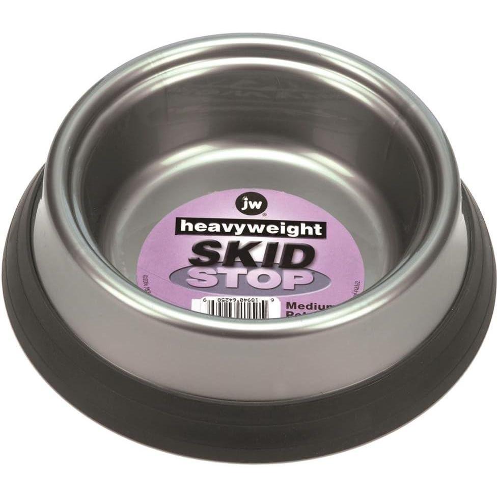 Stop your pet from scooting, sliding, and chasing his bowl across the floor with the JW Skid Stop Heavy Weight Plastic Bowl. This Skid Stop bowl is made of easy-to-clean, stain-resistant plastic with a heavy-duty rubber bottom rim. This rim makes it nearly impossible for your furry friend to skid, move or tip its bowl during mealtime. Dishwasher safe and rust resistant. Ships in assorted colors to complement your home decor.